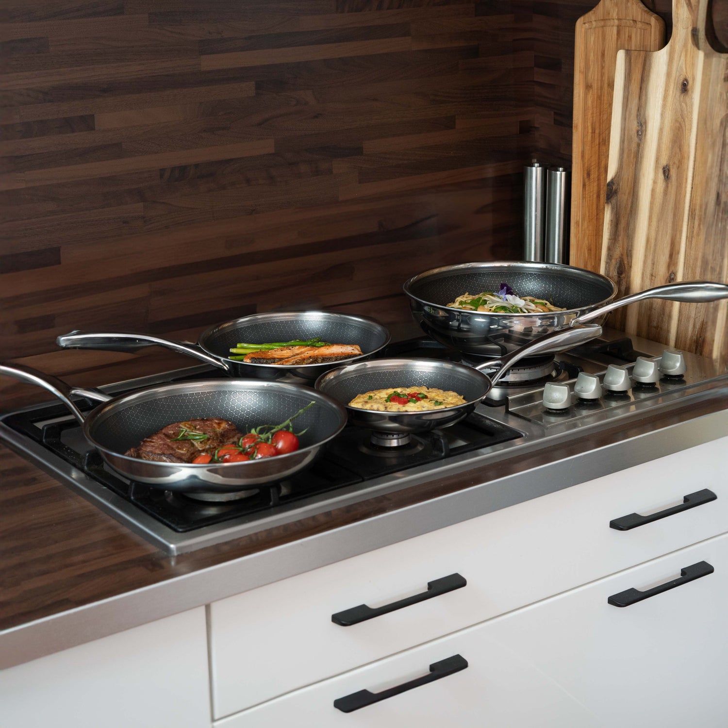 De Matero Cookware hybride pan maakt gebruik van geavanceerde hybride technologie die de voordelen van roestvrij staal en een antiaanbaklaag combineert. Dit zorgt voor een perfecte sear en een gemakkelijke reiniging, zonder in te boeten aan duurzaamheid. Met deze technologie geniet je van het beste van beide werelden: de kracht en duurzaamheid van roestvrij staal en de gemakkelijke voedselvrijgave van een antiaanbaklaag.